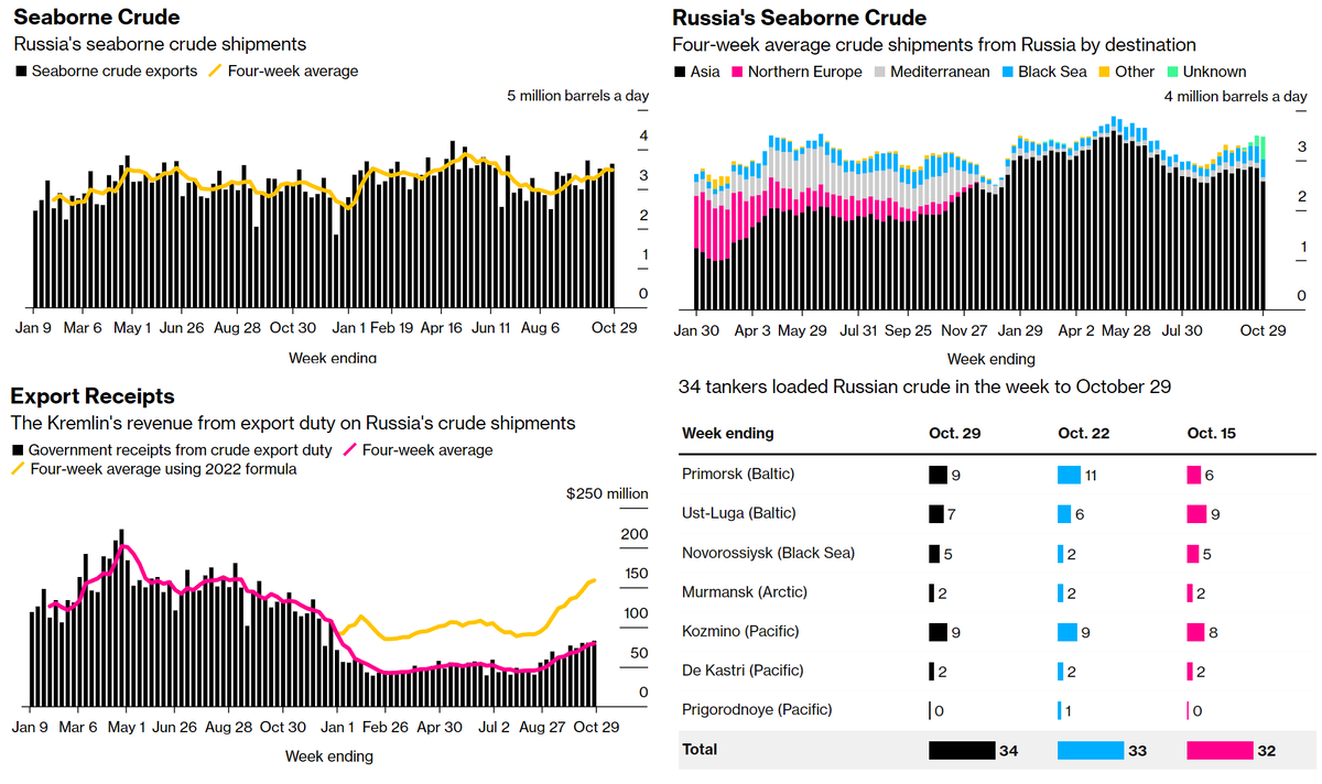 За неделю из отечественных портов ушло 34 танкера. Больше всего (по 9) из Приморска, что на Балтике, и из Козьмино (Тихий океан).