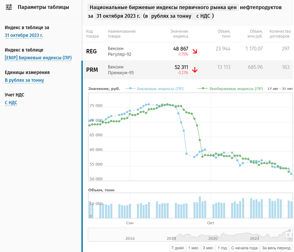 Аи-95 с сентябрьских максимумов 76 068 руб. за тонну ушел уже на 52 311, потеряв уже 31,2%. Это апрельский уровень цен.