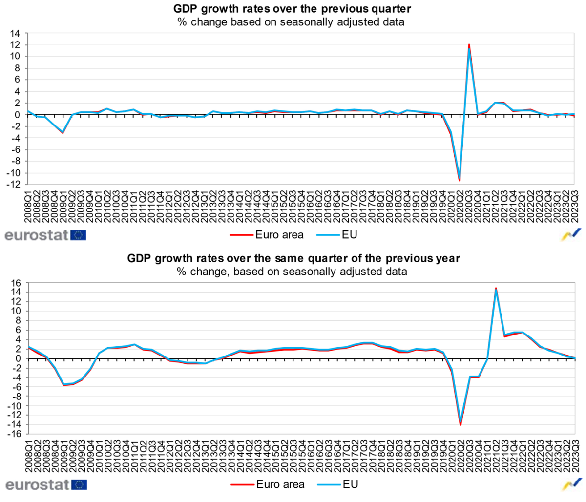 В годовом выражении экономика еврозоны увеличилась на 0,1%.