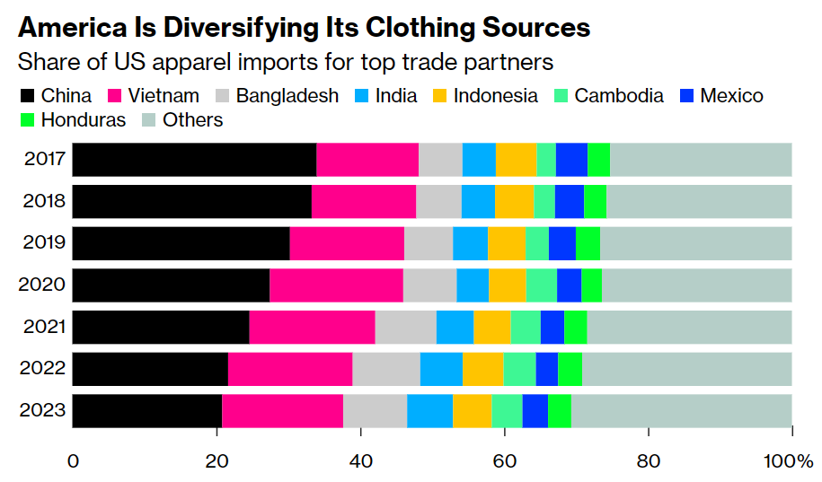 США диверсифицирует свой импорт одежды. Доля Китая уменьшилась с 34% в 2017 году до 20,8% в текущем.