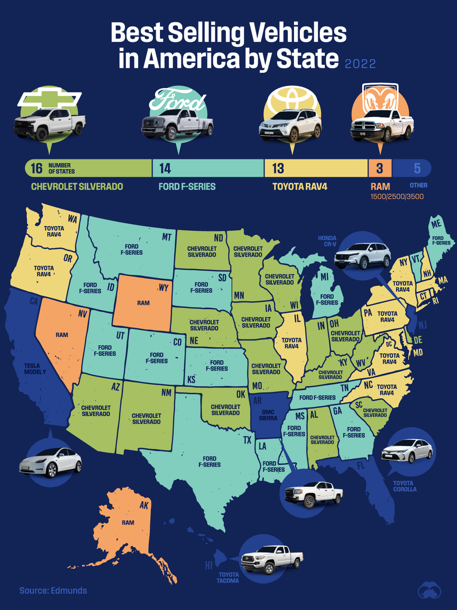Тут что интересно, только в одном штате топовое место взял седан. Это Флорида и это Тойота Королла. Ах, да... еще Калифорния с Теслой Y, но то вообще идет отдельной строкой - "электричка". А в остальном пикапы с паркетником.