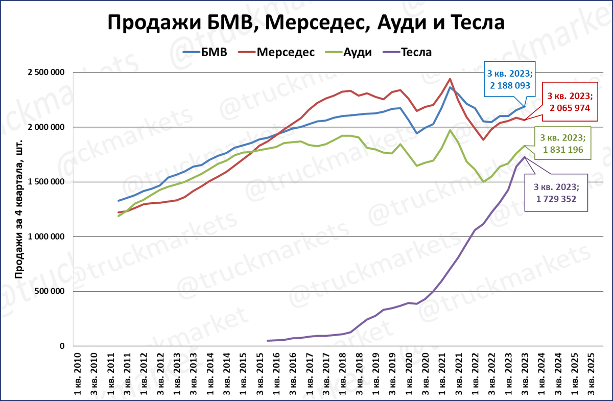 В третьем квартале было продано 1,98 млн премиум-автомобилей четырёх марок: БМВ, Мерседес, Ауди и Тесла.