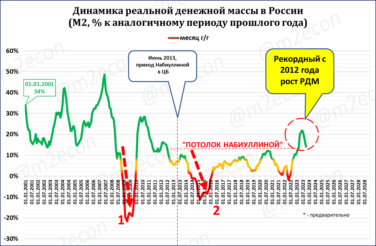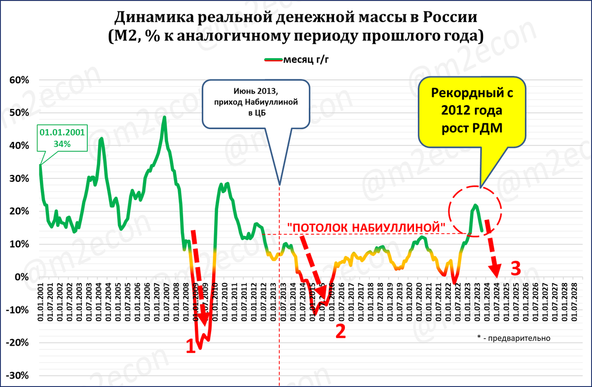 Но сейчас ЦБ предпринимает титанические усилия, чтобы рост реальной денежной массы резко замедлить (см. красную пунктирную стрелку 3). И это ему удаётся -- динамика резко снижается.