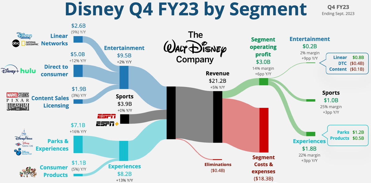Первый и последний пункты заносят по, примерно, 9 млрд $ в квартал. Кто-то больше, кто-то меньше. Спорт в два раза меньше. А вот что касается чистого дохода, то там у телевидения совсем мало. Чуть больше спорт. И парки прям от души - 1,8 млрд $.