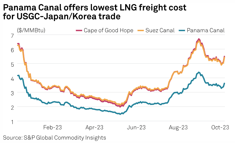 Октябрь был самым засушливым месяцем с начала регистрации показателей 73 года назад. Всё это оказывает влияние на систему водохранилищ Панамского канала, а через это на его проходимость. Управление канала сократило количество бронирований для судов с 31 до 25 в этом месяце. И скоратит до 18 с 1 февраля 2024. В хорошие дни проходимость составляла 38-40 в день.