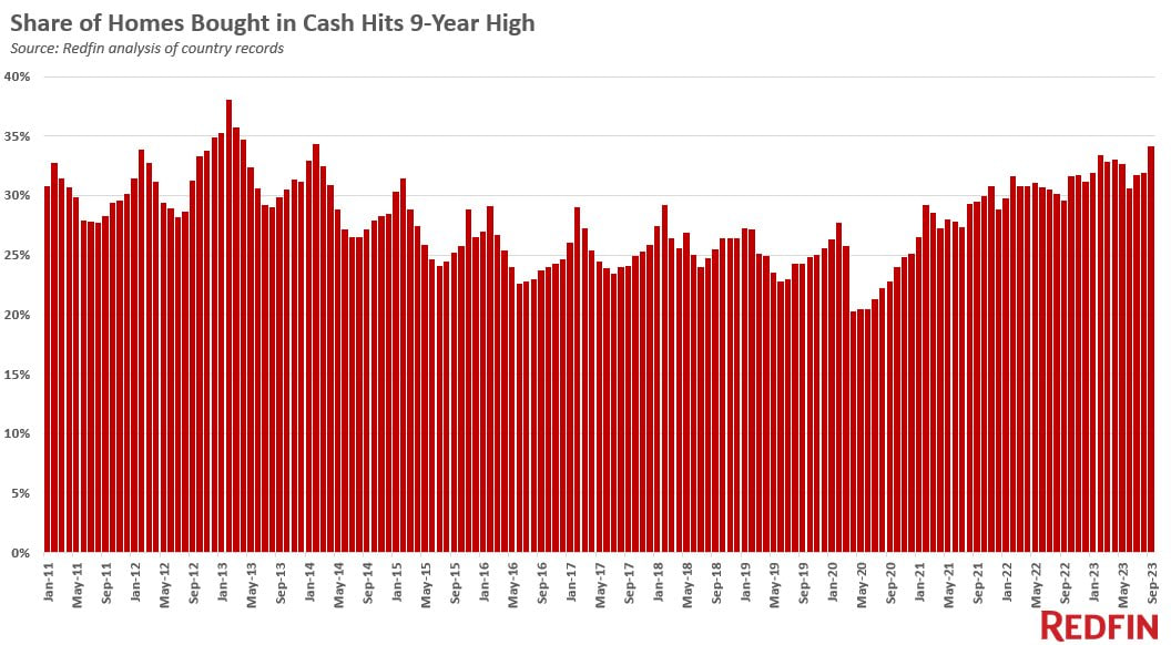 Сообщают, что 34,1% покупок жилья в США были совершены за счет собственных средств. То есть без привлечения ипотеки. Это по сравнению с 29,5% годом ранее. Кстати, сейчас практически самый высокий уровень за десятилетие.