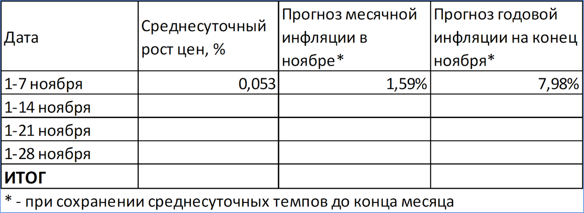 Если темп первых семи дней ноября сохранится до конца месяца, то по его итогам инфляция составит 8% годовых.