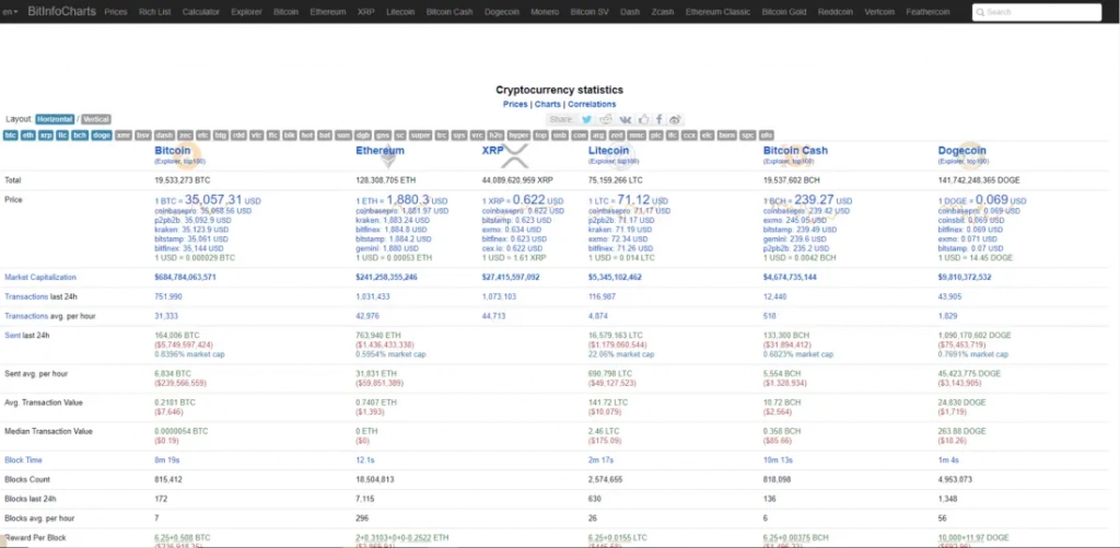 Bitinfocharts — это инструмент, который предоставляет массу статистической информации по различным криптовалютам. Здесь можно найти данные по средней стоимости транзакции, активности в блокчейнах и многому другому, что делает его ценным ресурсом для комплексного анализа.