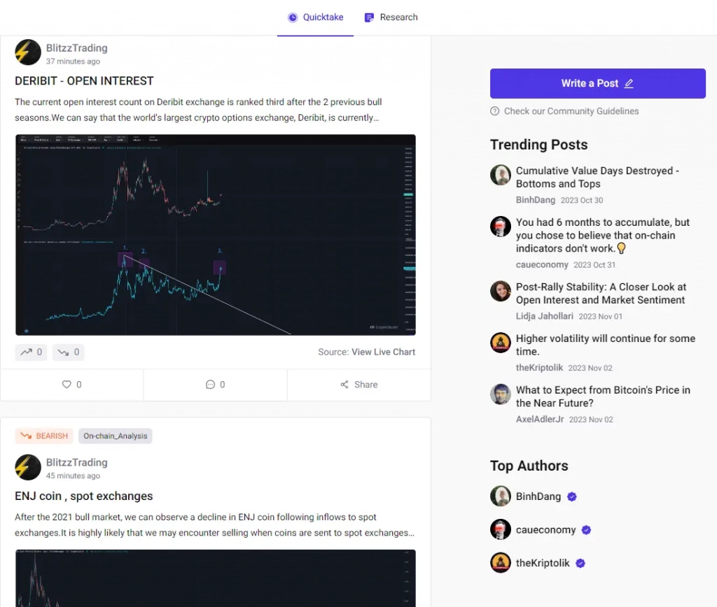 Применение: С помощью Quicktakes от CryptoQuant трейдеры могут получать оперативные аналитические сводки, которые могут быть использованы для определения момента для совершения сделок, основываясь на активности крупных держателей монет или изменениях в сетевых параметрах, таких как потоки транзакций.