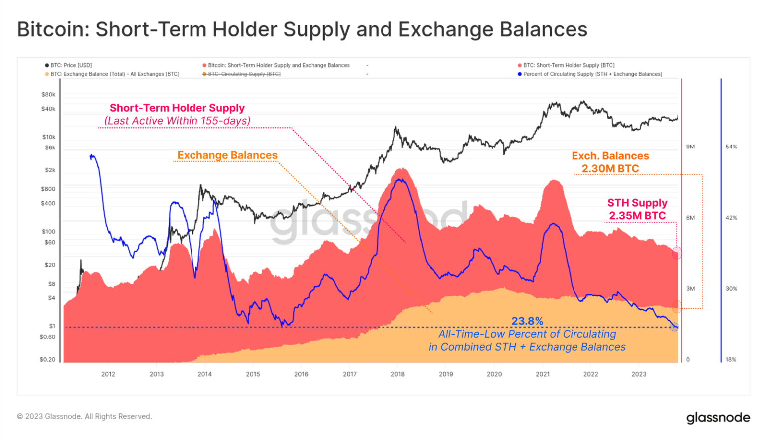 Аналитики сравнили объем принадлежащих спекулянтам биткоинов с биржевыми балансами и обнаружили сопоставимость этих величин (2,39 млн BTC и 2,3 млн BTC соответственно). В совокупности эти два показателя «доступного предложения» составляют 23,8% от выпущенных монет — рекордно низкий уровень.