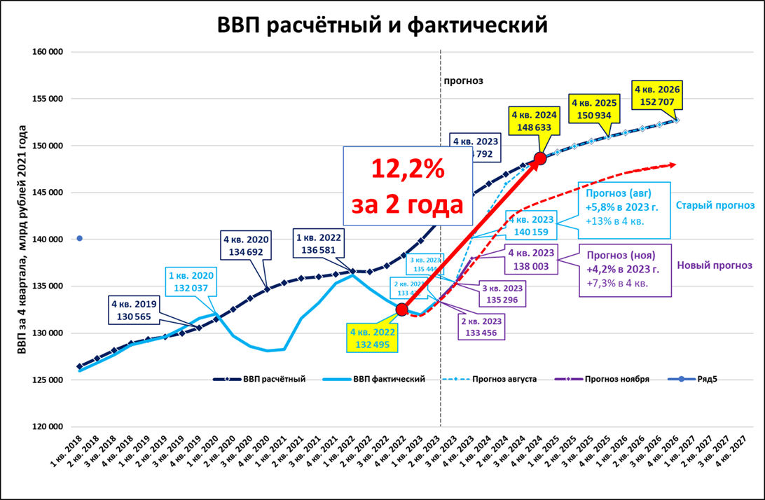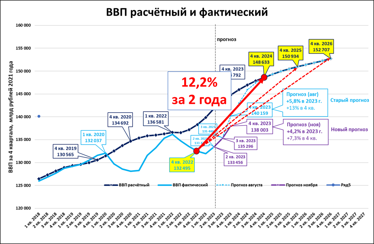 Говоря проще, ВВП из первой красной точки (это итоги 2022 года; 132,5 трлн рублей в ценах 2021 года) придёт во вторую красную точку (это итоги 2024 года; 148,6 трлн рублей в ценах 2021 года).