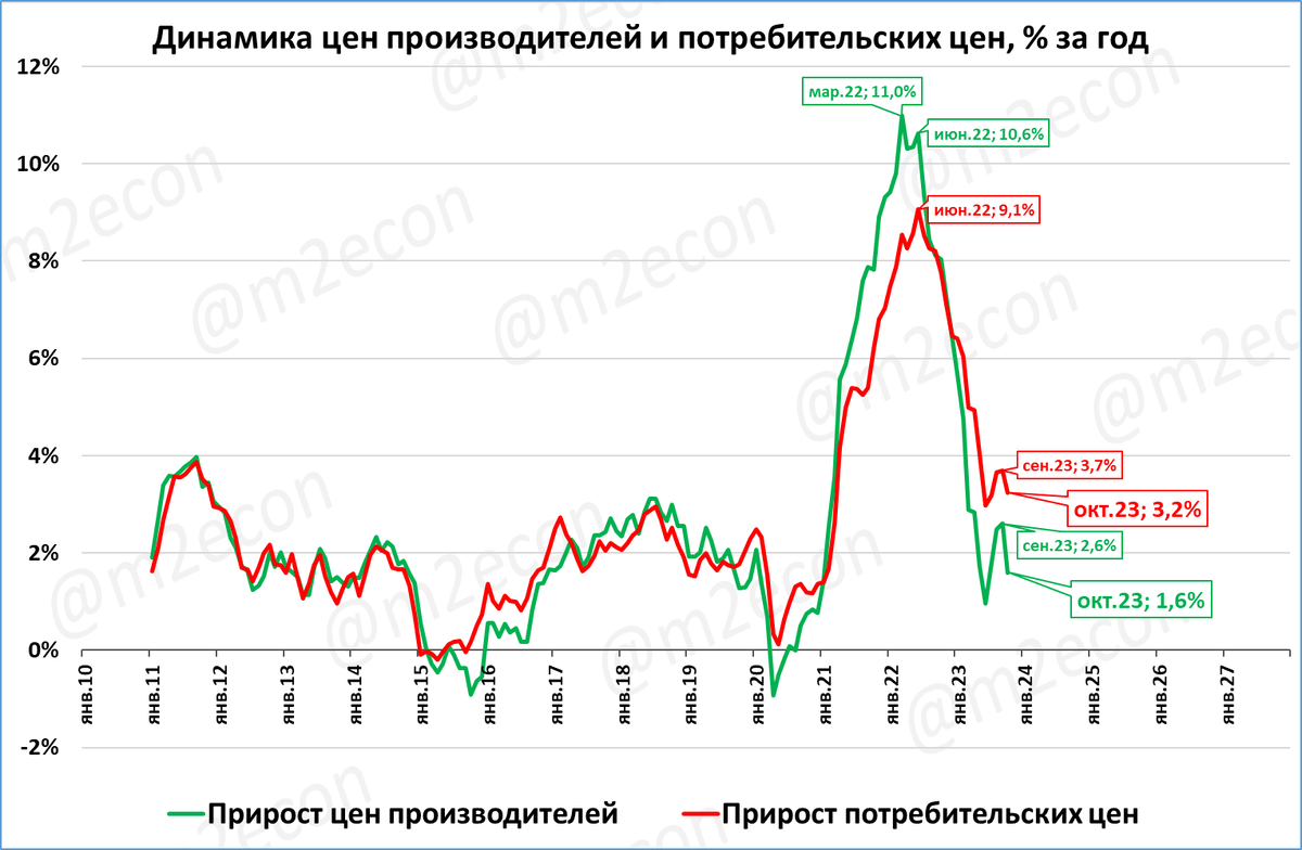 В США инфляция в октябре снизилась до 3,2% годовых (3,7% в сентябре). При этом цены производителей падают в реальном выражении, что является негативным сигналом.