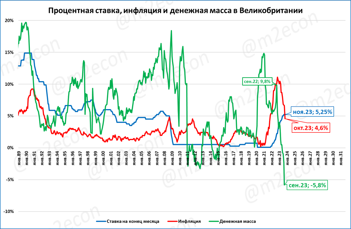 Инфляция в Британии снизилась в октябре до 4,6% годовых (6,6% в сентябре). При этом падение реальной денежной массы продолжается.