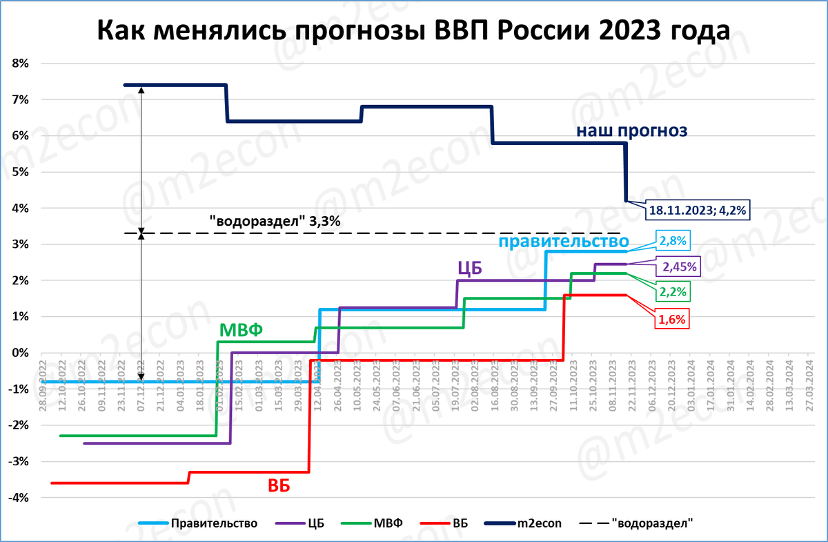 Ещё раз напомню, что осенью 2022 года только наш прогноз предполагал рост ВВП (на 7,4%). Другие прогнозы предполагали падение ВВП на 1-4%. Сейчас, когда вопрос стоит о том, вырастет ВВП на 3% или больше, очевидно, что прогнозы падения были ошибочными.