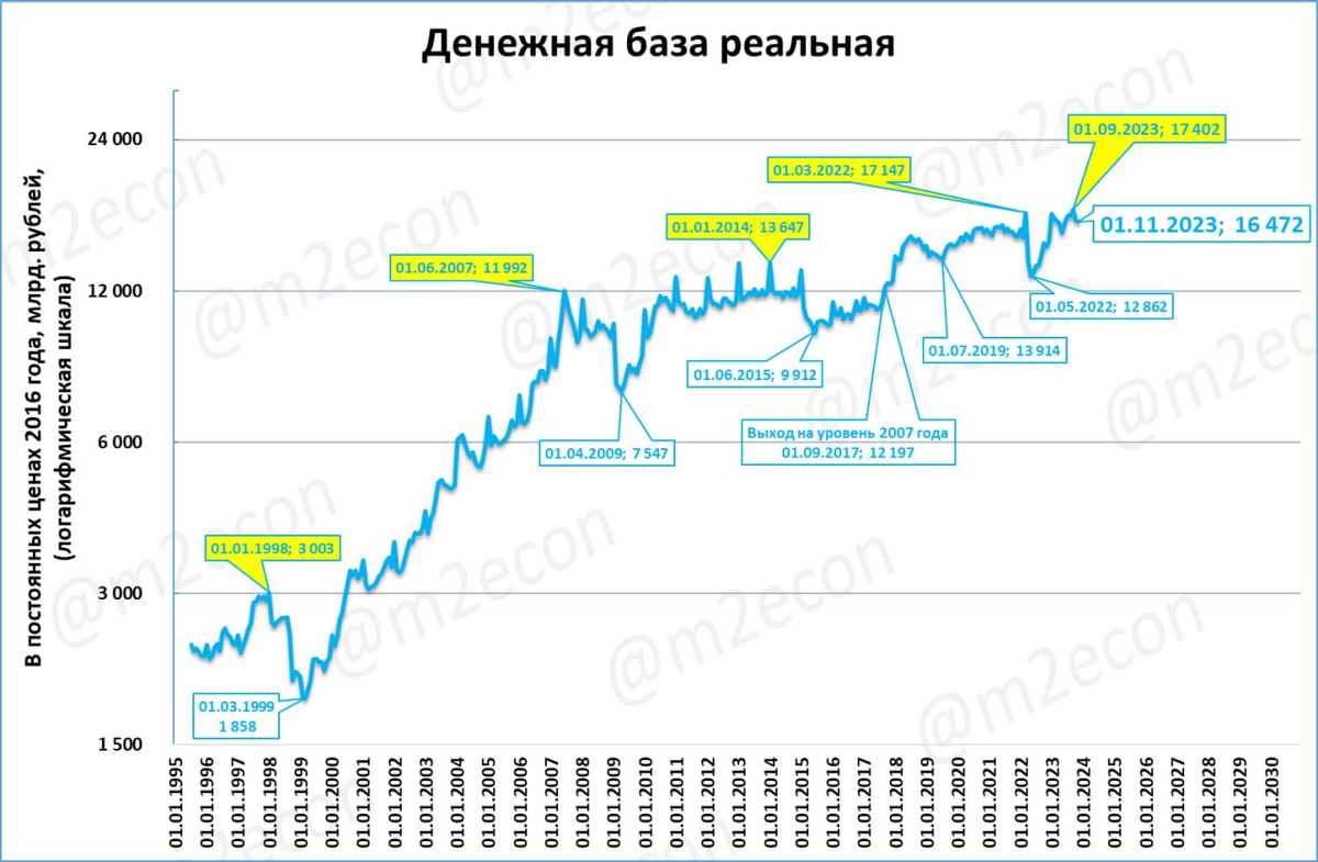 В реальном выражении (с поправкой на инфляцию) денежная база составляет 16,5 трлн рублей в ценах 2016 года.