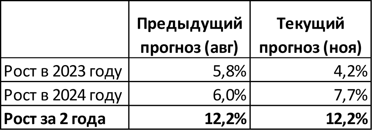 Оба прогноза предполагают рост на 12,2% за два года, меняется лишь распределение по годам.
