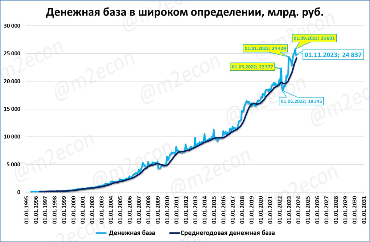 Широкая денежная база (или просто денежная база, ДБ) на 1 ноября составила 24,8 трлн рублей.