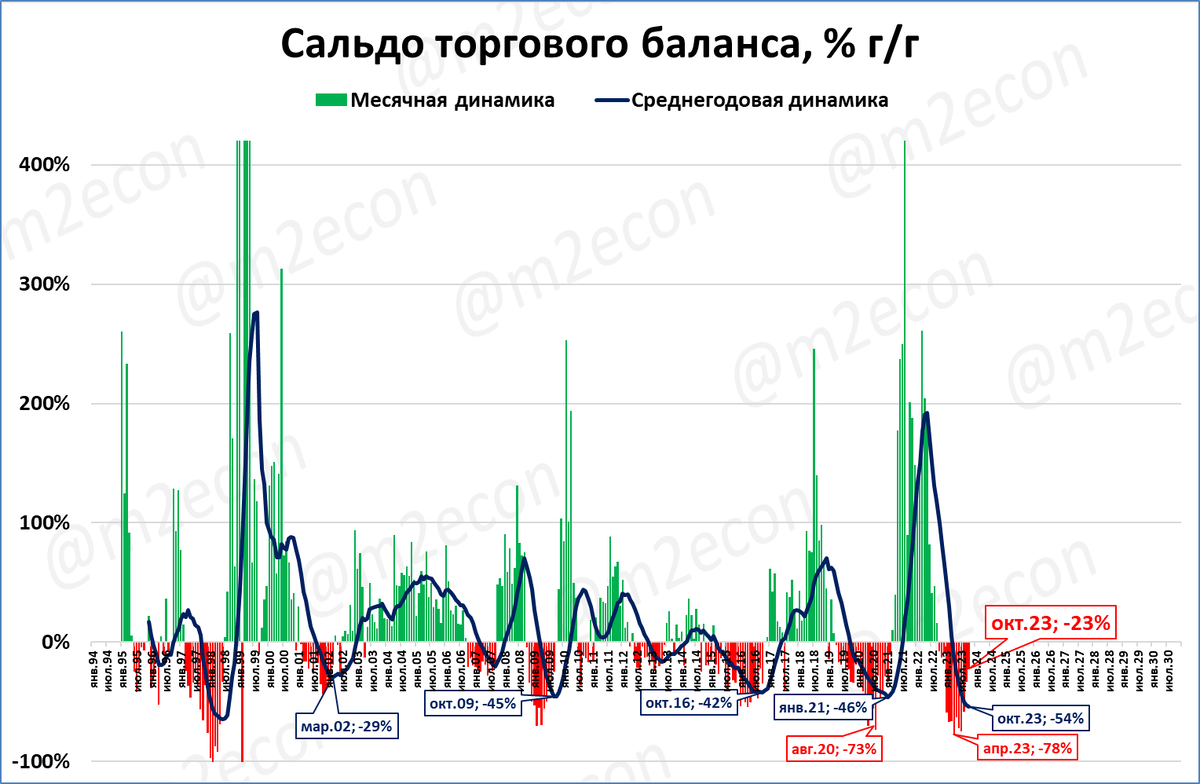 Сальдо торгового баланса в октябре составило 14,3 млрд. долларов. Падение замедлилось с -78% в апреле до -23% в октябре. Сальдо стабилизируется на отметке около 120-130 млрд за 12 месяцев.