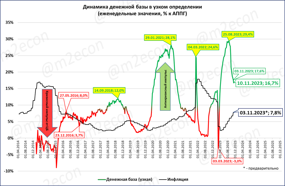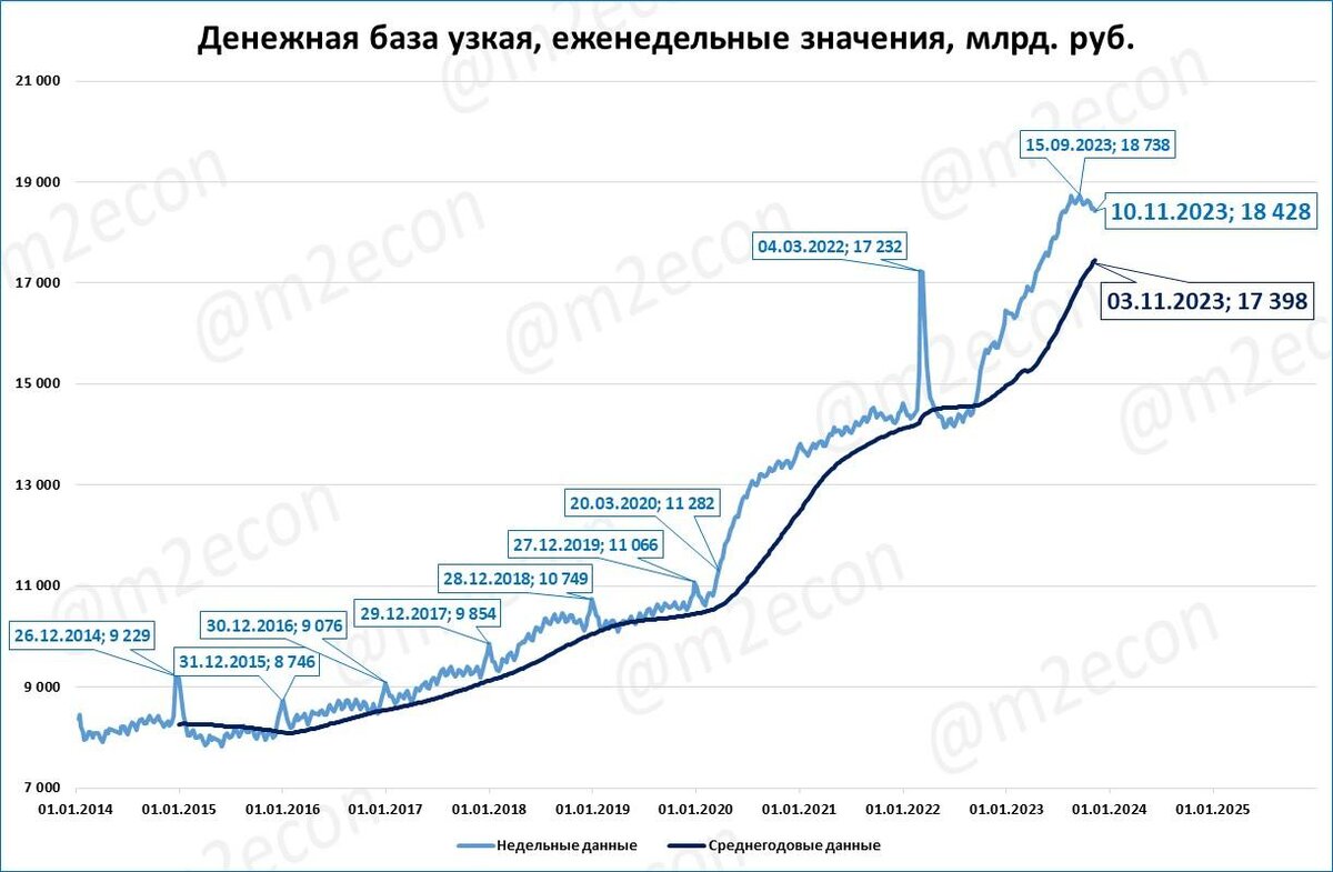 Узкая денежная база: рост показателя продолжает замедляться в ноябре, что является признаком замедления и денежной массы.
