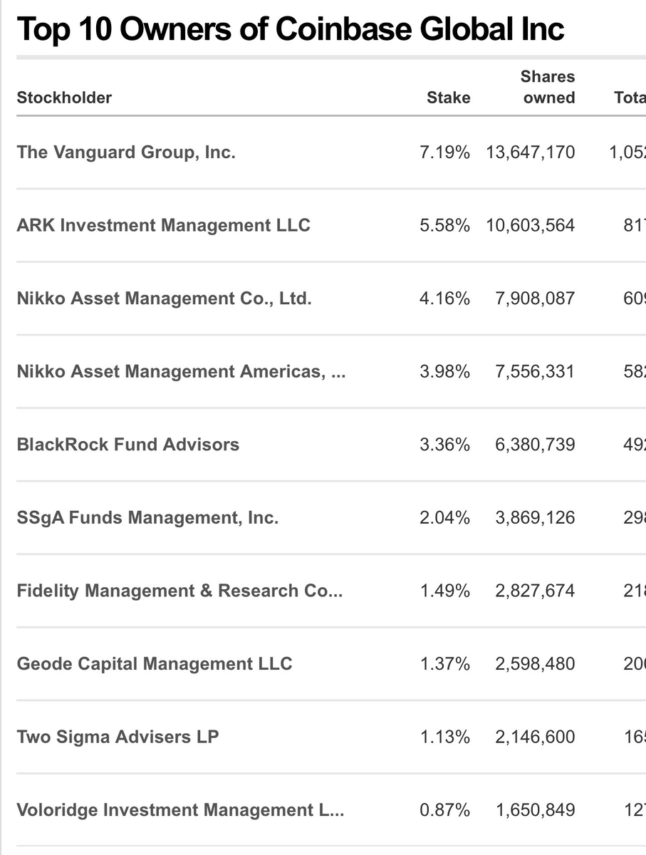 На первой картинке Топ-10 владельцев американской криптовалютной площадки Coinbase. Смотрите, тут вам и Vanguard, тут вам и Fidelity, тут и BlackRock. Я напомню, это те конторы, которые всячески продвигают спотовый ETF на биток на рынках США и дожимают в этом вопросе SEC. А уж потом, в рамках торговли этими самыми ETF, спотовый биток будет приобретаться на бирже Coinbase. Здорово, правда?