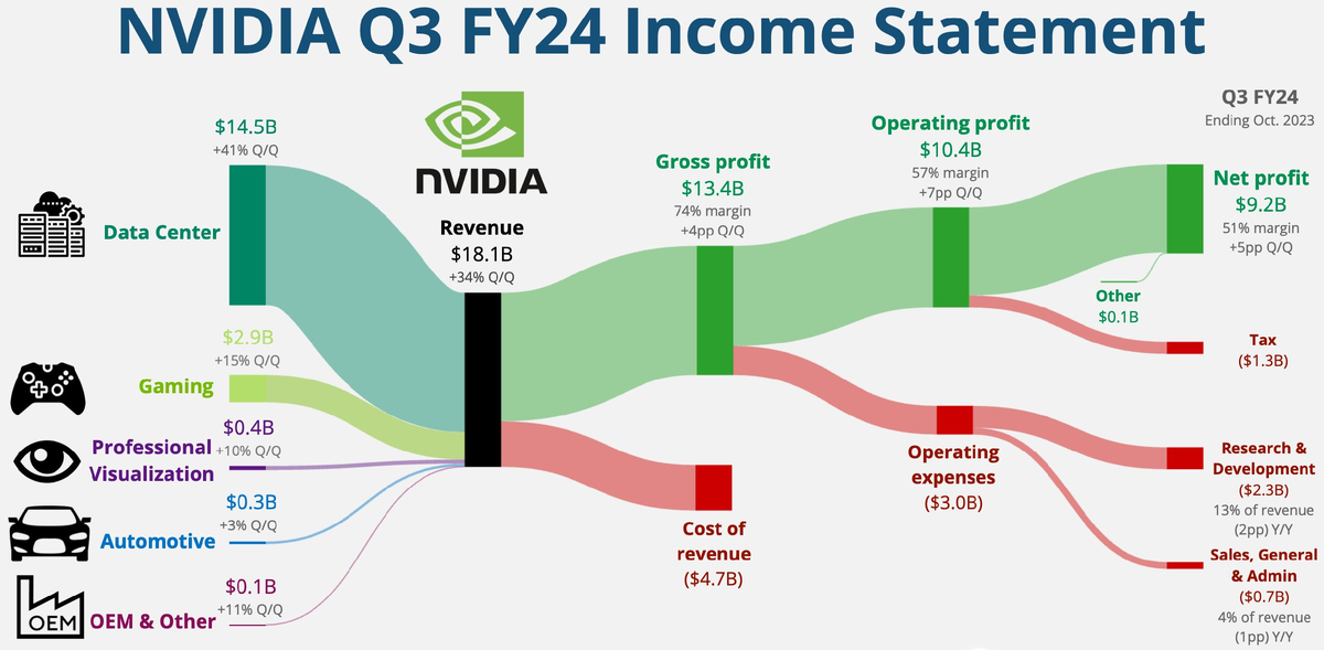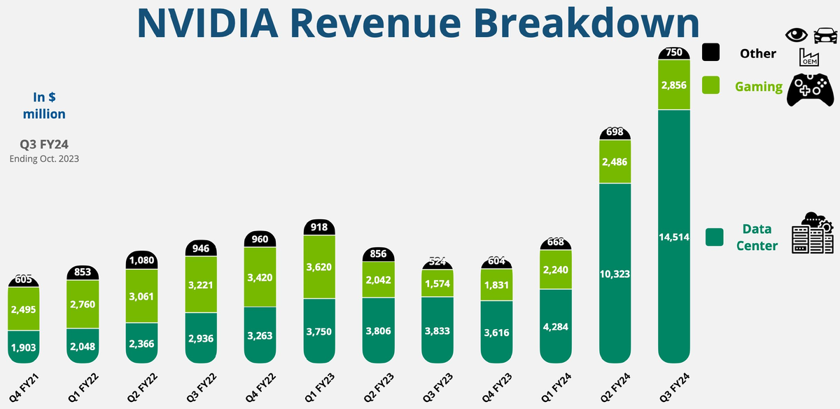 Локомотивом выручки выступает серверный сегмент компании. «Взрыв» его произошёл в прошлом квартале, а сейчас только усилился. За 3 квартал выручка от датацентров выросла на 41%, а за год на все 279%. В целом выручка компании за год выросла на 206%.