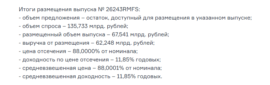 Всего было продано бумаг на общую сумму 67 млрд 541 млн рублей по номиналу при спросе 135 млрд 733 млн рублей по номиналу. Выручка от аукциона составила 62 млрд 248 млн рублей.