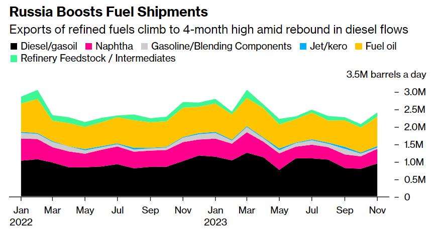 Согласно данным аналитической компании Vortexa Ltd, собранным агентством Bloomberg, поставки всякого нефтепереработанного из России подскочили примерно до 2,4 млн. баррелей в день по состоянию на 18 ноября. Это примерно на 333 000 баррелей в день больше, чем в октябре. Четырехмесячные максимумы близки.