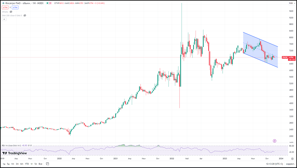 С начала 2023 года акции ФосАгро показывают рост в районе 5%, что значительно хуже индекса Мосбиржи, который показал рост примерно на 50%. Но правда, это без учета дивидендов. Сейчас котировки находятся на средних уровнях за последние два года. А с конца августа наметилась небольшая коррекция.