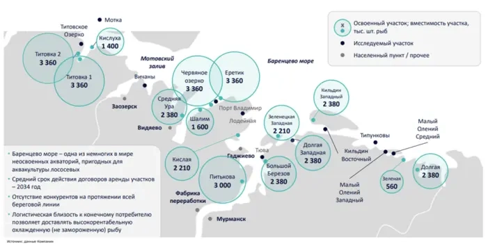 В компании садковые комплексы в холодных, кристально чистых водах Баренцева моря, смолтовые заводы (выращивание малька), кормовой завод, фермы где рыба набирает вес, выходы на прилавок + заводы по переработке рыбы. Т.е. можно говорить о полноценной вертикальной интеграции бизнеса.