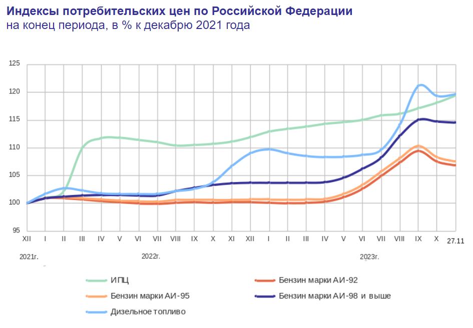 За неделю с 21 по 27 ноября 2023 г. на потребительском рынке инфляция составила 0,33%, год к году – 7,54%.