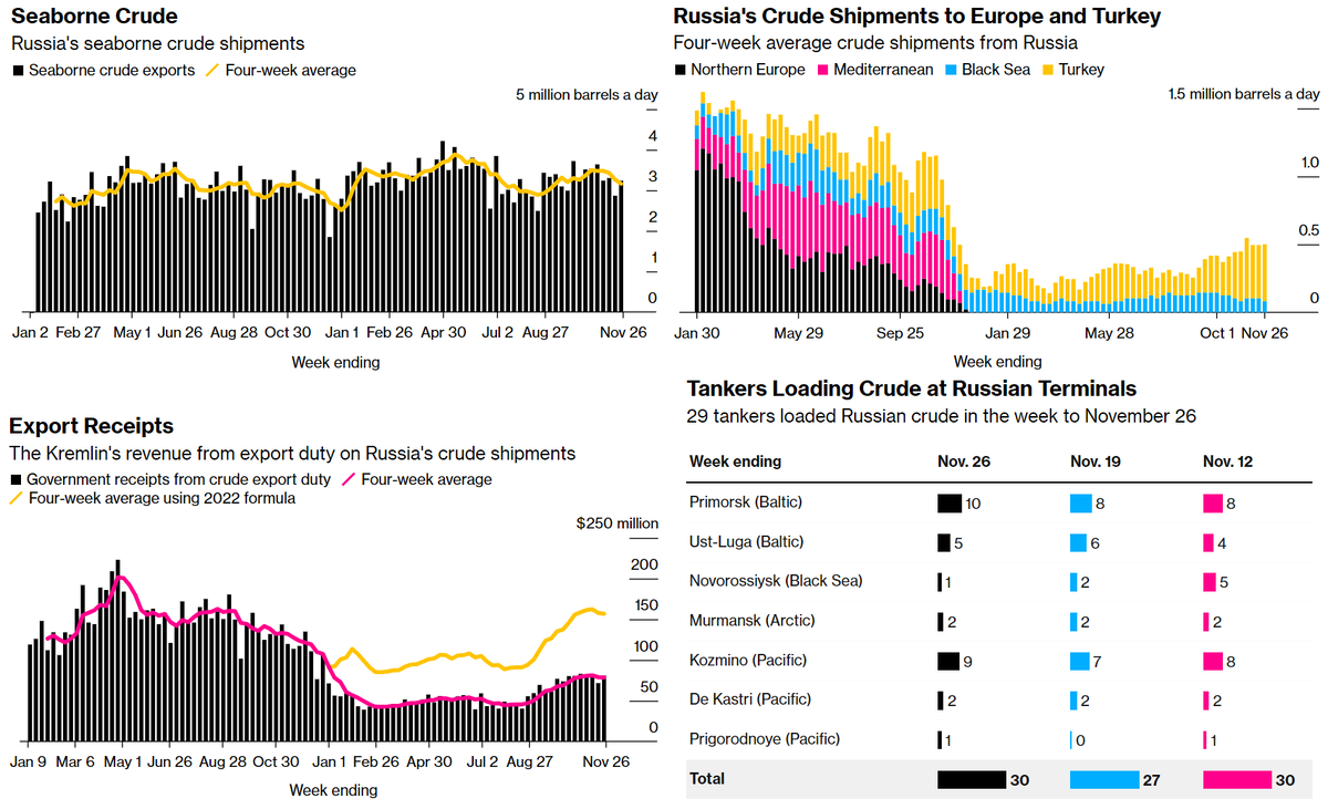 За неделю до 26 ноября из российских портов отгружалось около 3,24 млн баррелей сырой нефти в день. Это на 370 000 баррелей в день больше по сравнению с пересмотренным показателем за период до 19 ноября, даже несмотря на то, что погрузка танкеров в Черном море была нарушена из-за штормов.