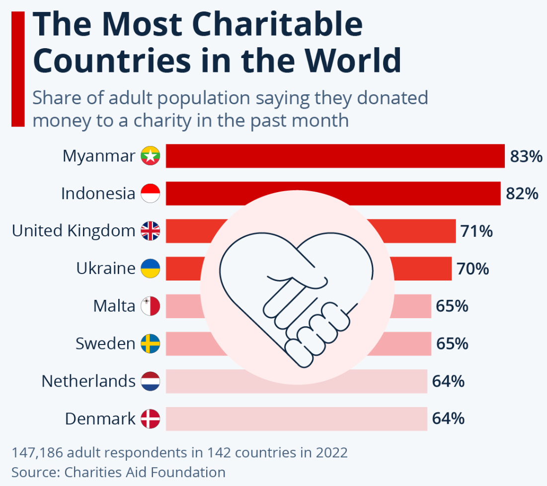 Последний отчет Charities Aid Foundation показал, какие страны можно считать самыми щедрыми и благотворительными в мире. Как показывает график, 83 процента жителей Мьянмы сделали пожертвования на благотворительность за месяц до опроса, что является самым высоким показателем во всем мире.