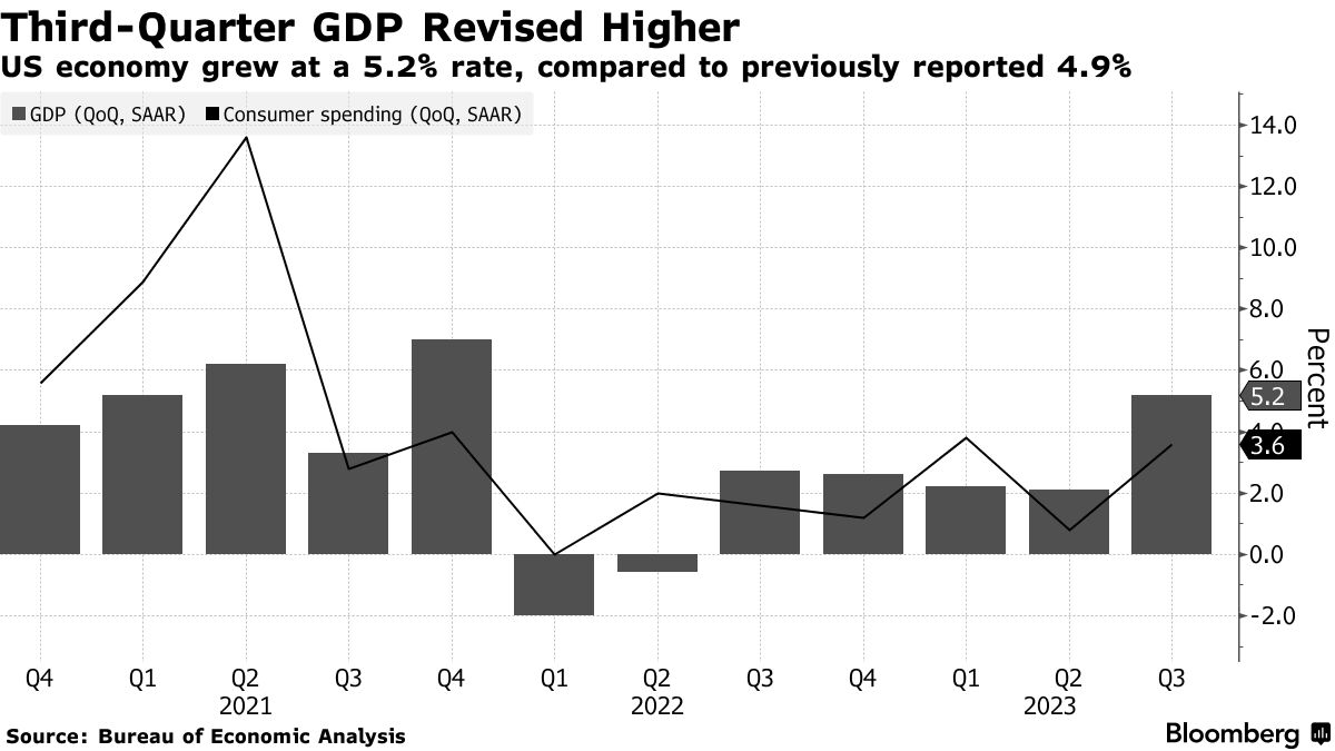 Потребительские расходы, на которые приходится две трети экономики США, в июле-сентябре повысились на 3,6% (предварительно сообщалось о росте на 4%, что также является самым существенным приростом с последнего квартала 2021 года).