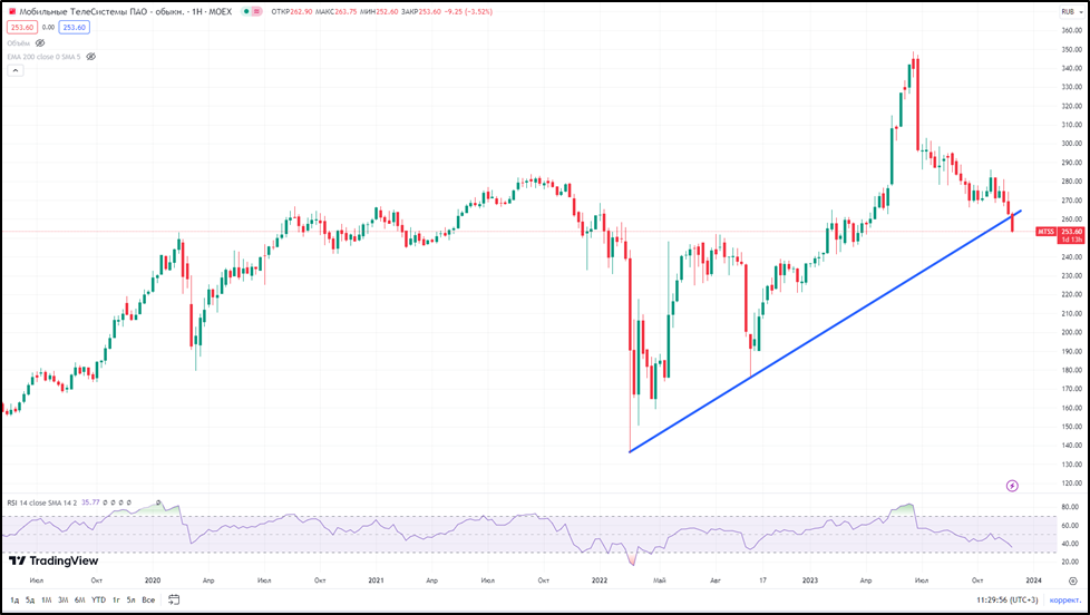 В конце июня 2023 года акции установили новый исторический максимум 349 ₽. Но с тех пор котировки снизились почти на 30%. И сейчас торгуются на средних за последние три года уровнях. Также недавно была пробита линия поддержки восходящего тренда.