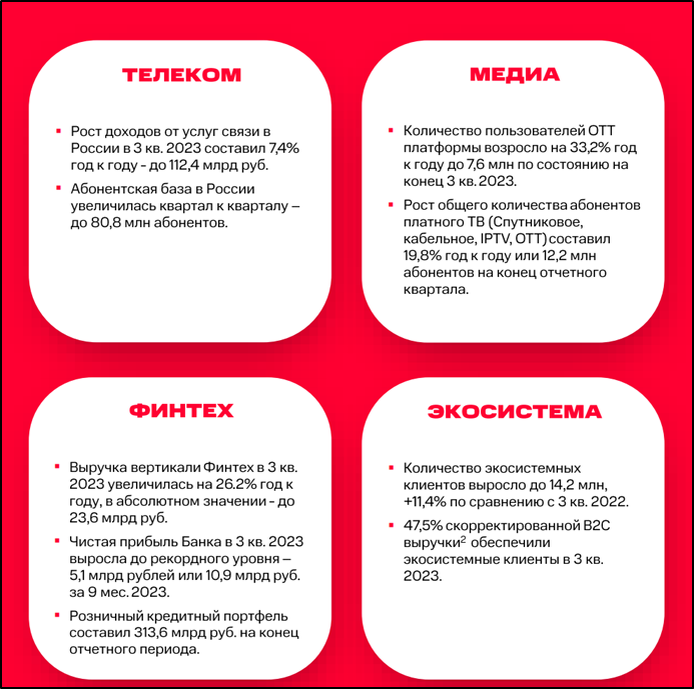 Выручка 446 млрд (+12% г/г). Основные драйверы: рост тарифов на связь, восстановление продаж телефонов, увеличение выручки Финтеха, масштабирование реклaмного бизнеса.