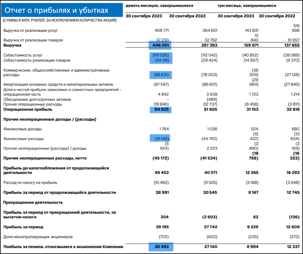 Финансовые результаты за 9М 2023 также хорошие. Но третий квартал получился неоднозначным. При рекордной выручке, чистая прибыль оказалась низкой на фоне роста финансовых расходов.