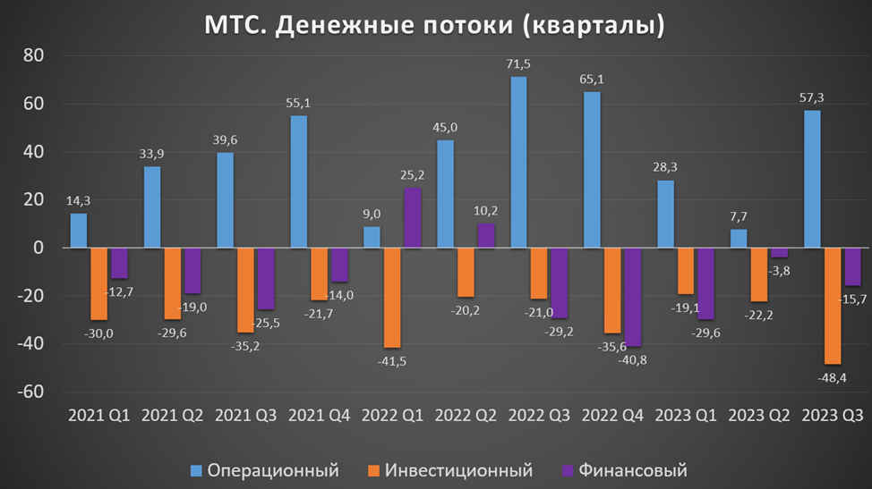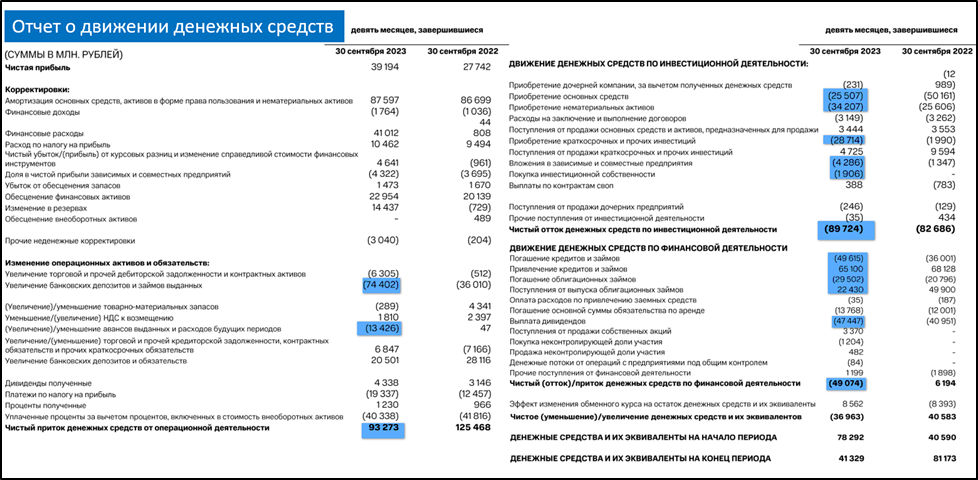 операционная деятельность 93 млрд (-25% г/г). Именно столько денег поступило в компанию за 9М 2023. Падение из-за снижения депозитов в МТС Банке и роста выданных авансов.