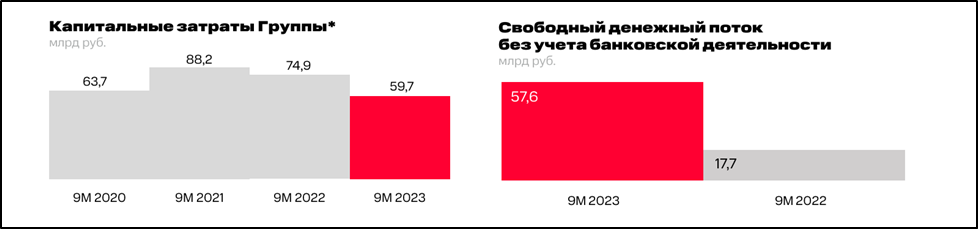 Правда, именно капитальные затраты суммарно за 9М 23 самые низкие за последние три года. Благодаря этому, свободный денежный поток без учета банковской деятельности 57,6 млрд, что в 3 раза лучше, чем год назад. Это очень высокое значение. Но в четвертом квартале МТС ожидает увеличение кап затрат, при этом свободный денежный поток нормализуется.