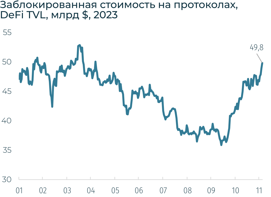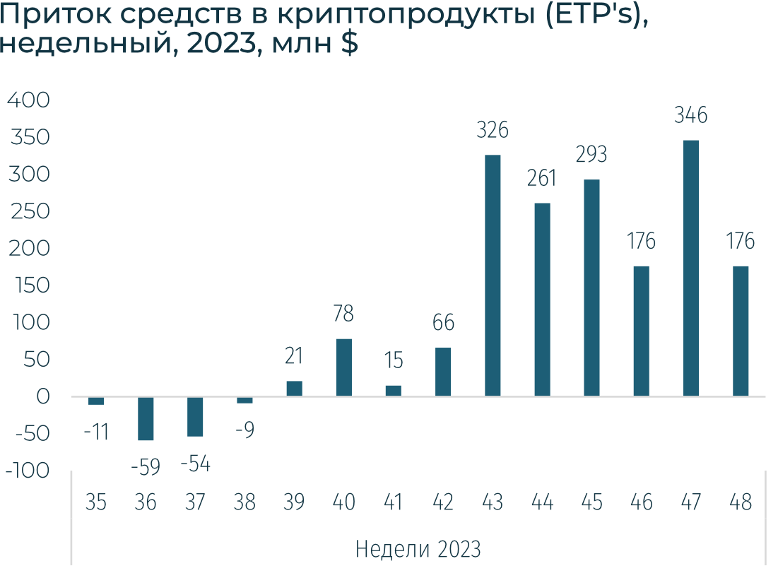 Комиссия по ценным бумагам США (SEC) встретилась в ноябре с 8-ю заявителями на спотовый ETF, в т.ч. Grayscale, который планирует конвертировать крупнейший BTC траст GBTC ($25,9 млрд AUM) в ETF, и его кастодиан-партнера Coinbase. SEC может одобрить спотовые BTC между 5 и 10 января, когда нет промежутков для ожидания консультаций и обновления заявок. Напомним, что в JP Morgan считают, что одобрение спотового ETF приведет к оттоку $2,7 млрд с крипторынка, из-за притока в траст Grayscale для заработка на дисконте.