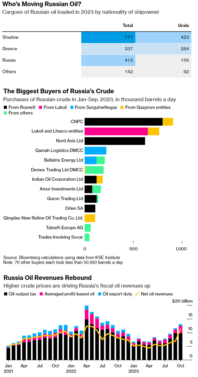 На первой - рейсы с российской сырой нефтью за 2023 год по принадлежности корабликов. Получается, «призраки» совершили 771 ходку, русские 413, греки 337 (привет Робину Бруксу) и остальные 142.