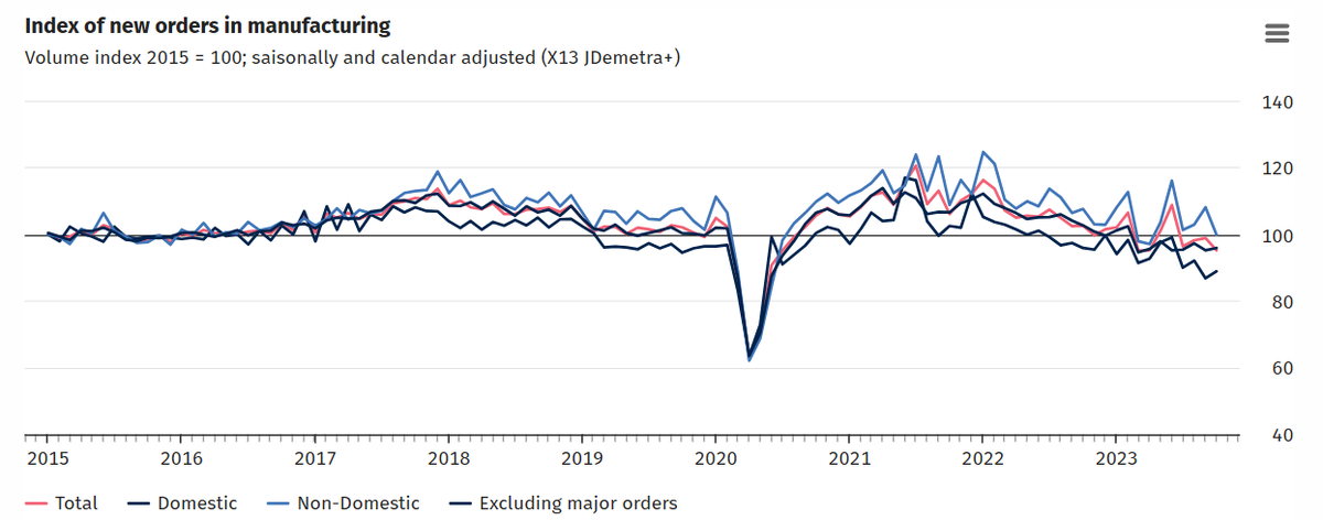 В октябре 2023 года количество новых заказов снизилось по сравнению с предыдущим месяцем как в секторе капитальных товаров (-6,0%), так и в секторе промежуточных товаров (-1,4%). Сектор потребительских товаров сообщил о росте на 2,8%.