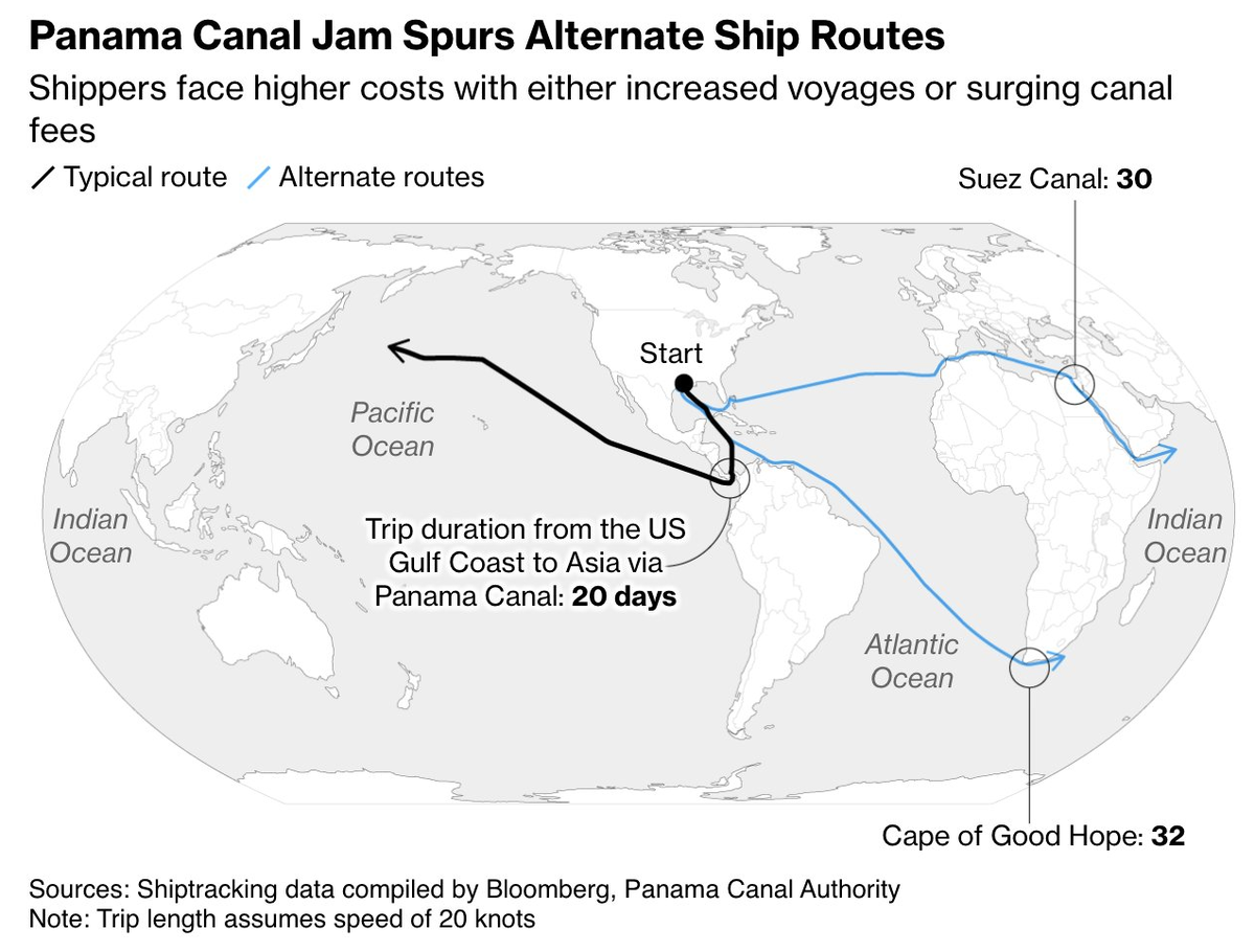 Вы же в курсе, что с чудом инженерной мысли, Панамским каналом, проблемы. Он из-за засухи немножко того... мелеет. Ну и поток через него в прошлых объемах невозможен.
