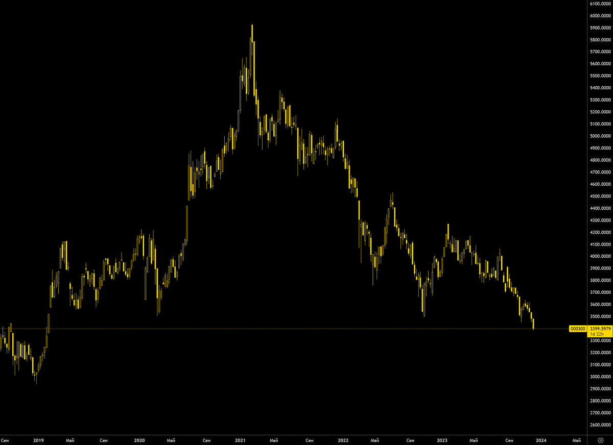 На картинке график индекса CSI 300 - 300 крупнейших акций, торгуемых на Шанхайской и Шэньчжэньской биржах.