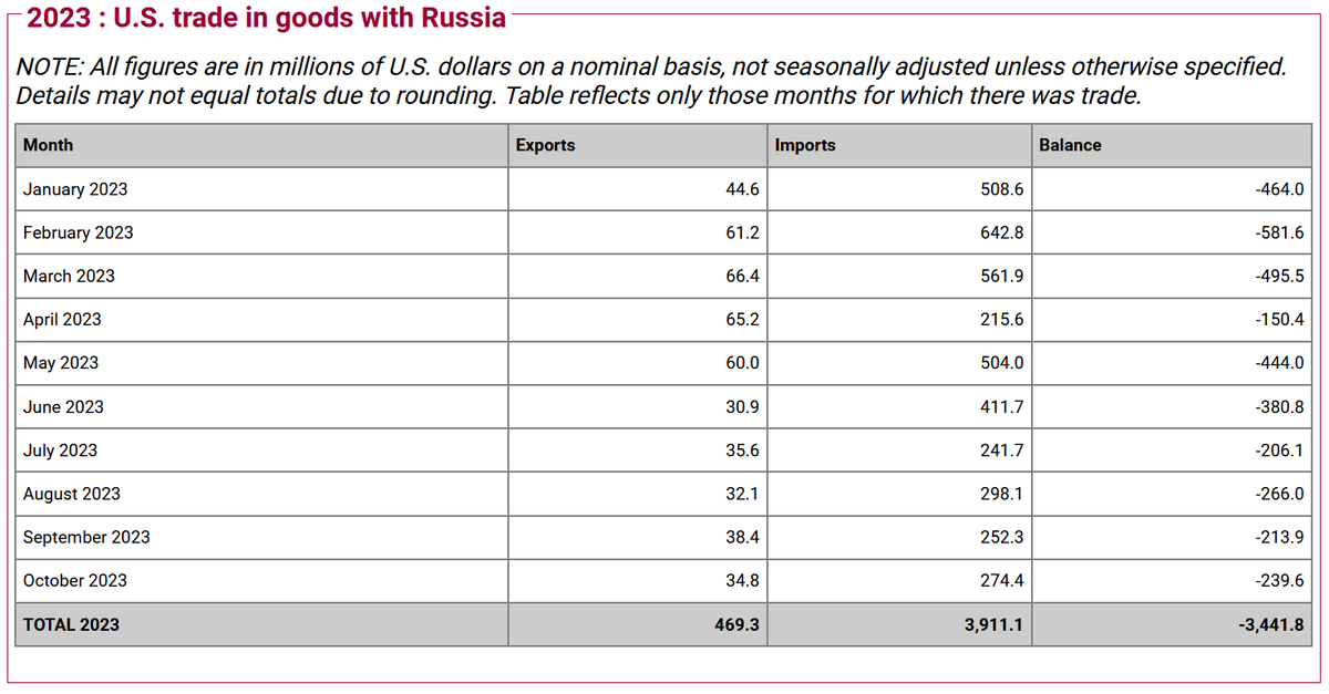 По последним данным, а это октябрь 2023, торговля между странами продолжается. Импорт российский товаров в США составил 274,4 млн $. Экспорт из США в - 34,8 млн $.