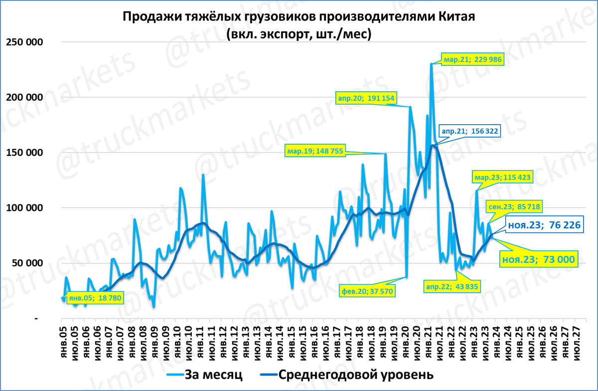 В ноябре китайские производители продали (на внутренний рынок + экспорт) 73 тыс. тяжёлых грузовиков.