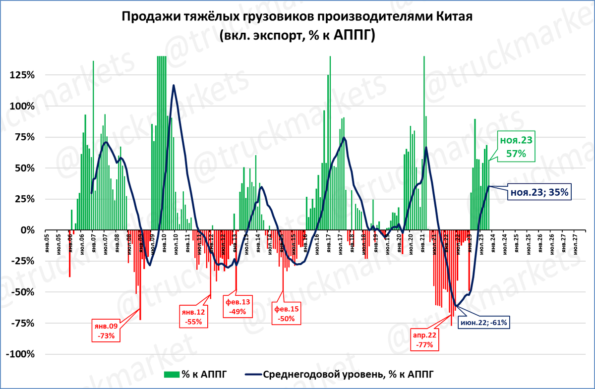 Продажи грузовиков китайскими производителями (экспорт+ внутренний рынок) выросли в ноябре на 57%.