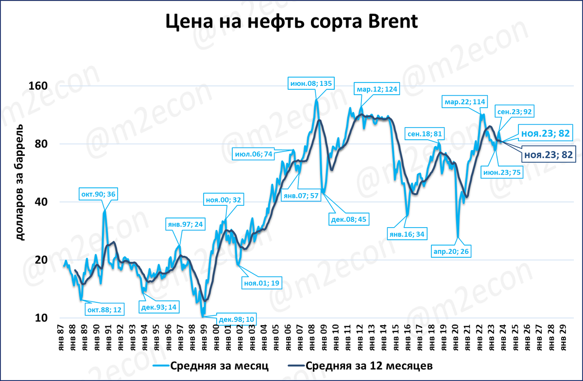 Цена нефти сорта Брент снизилась в ноябре до 82 долларов за баррель.