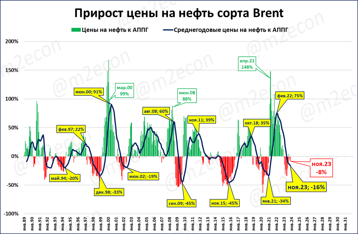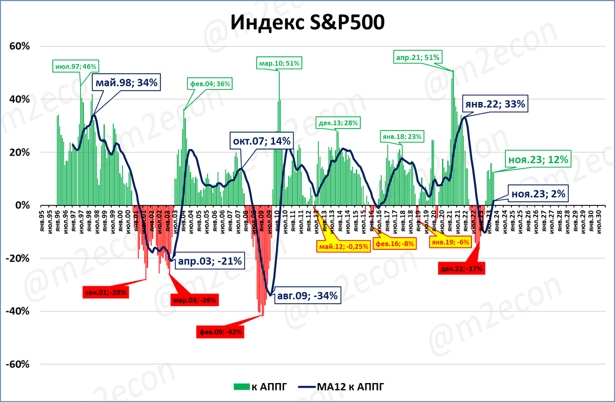 Среднегодовой индекс впервые (с ноября 2022 года) стал выше своих прошлых значений на 2% (тёмно-синяя линия вышла в положительную зону).