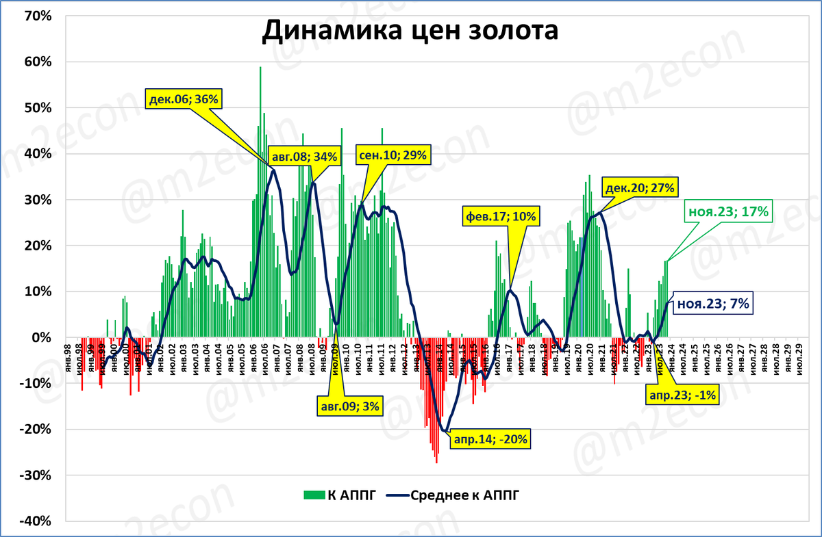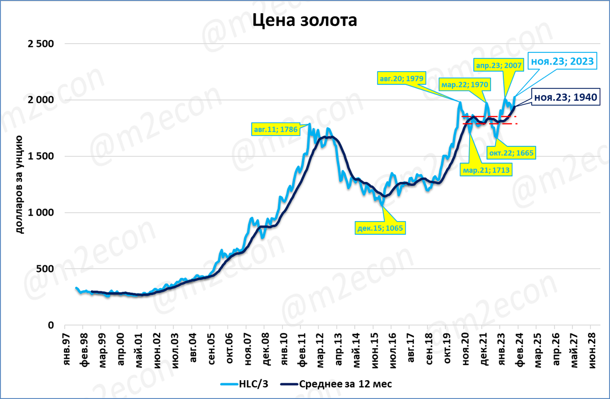 Средняя цена унции золота в ноябре составила 2023 доллара (не путайте, это не год!). Это новый максимум, предыдущий был в апреле 2023 года ($2007 за унцию).