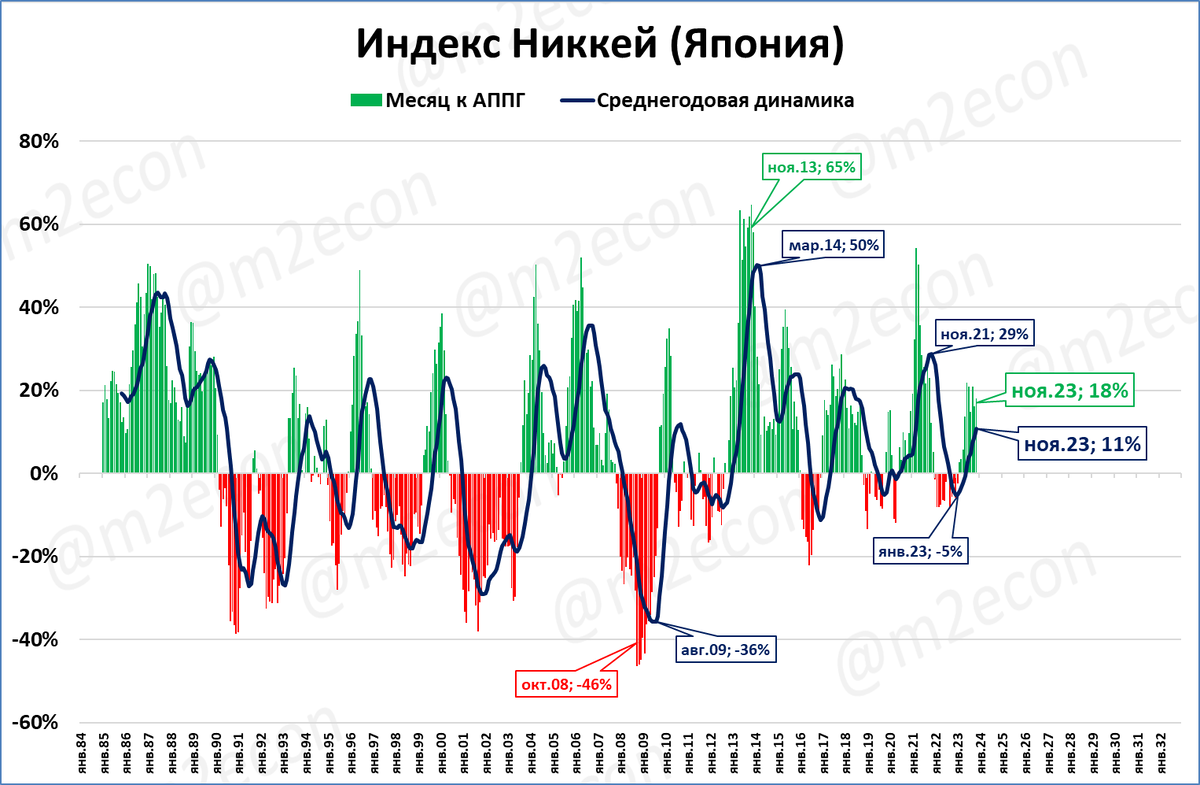Американские (+12% за год) и японские (+21%) фондовые индексы растут.